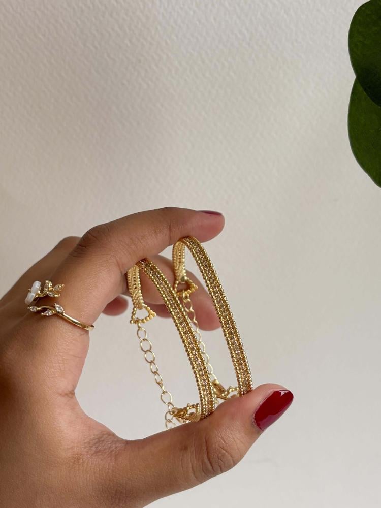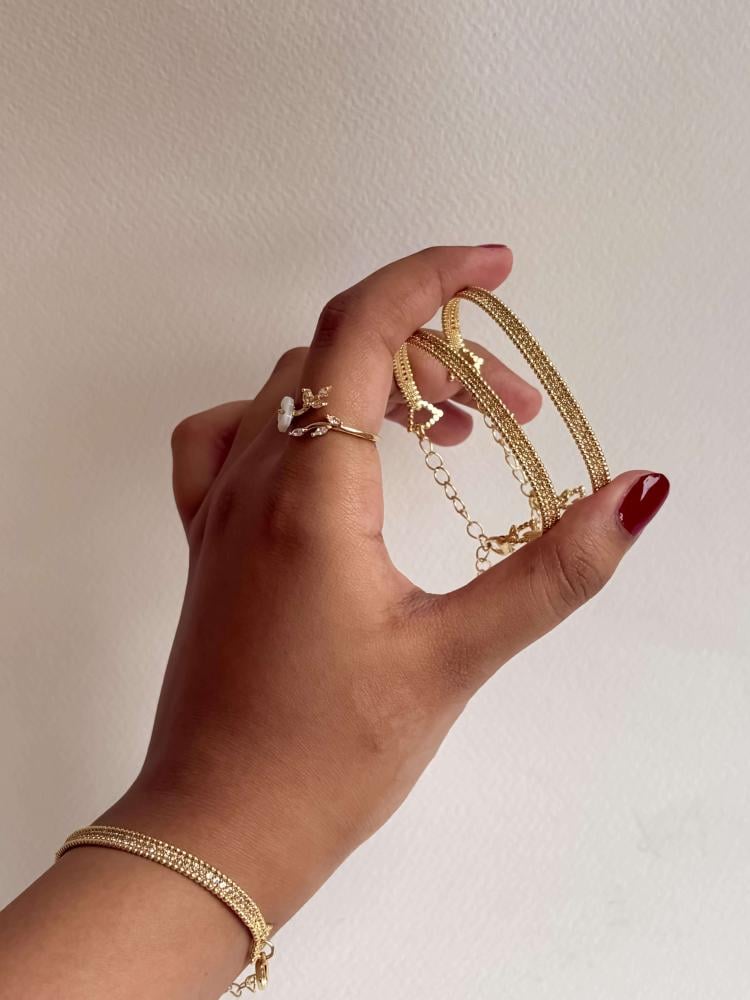 مطلية بماء الذهب بلمعة جذابة وثبات عالي. مزودة بسلسلة تعديل لسهولة التوسيع أو التضييق،