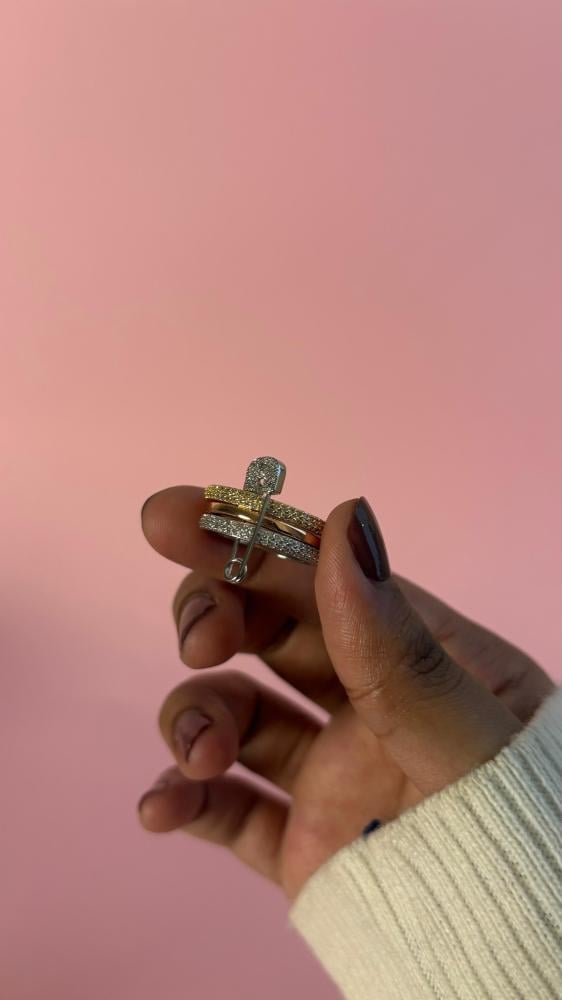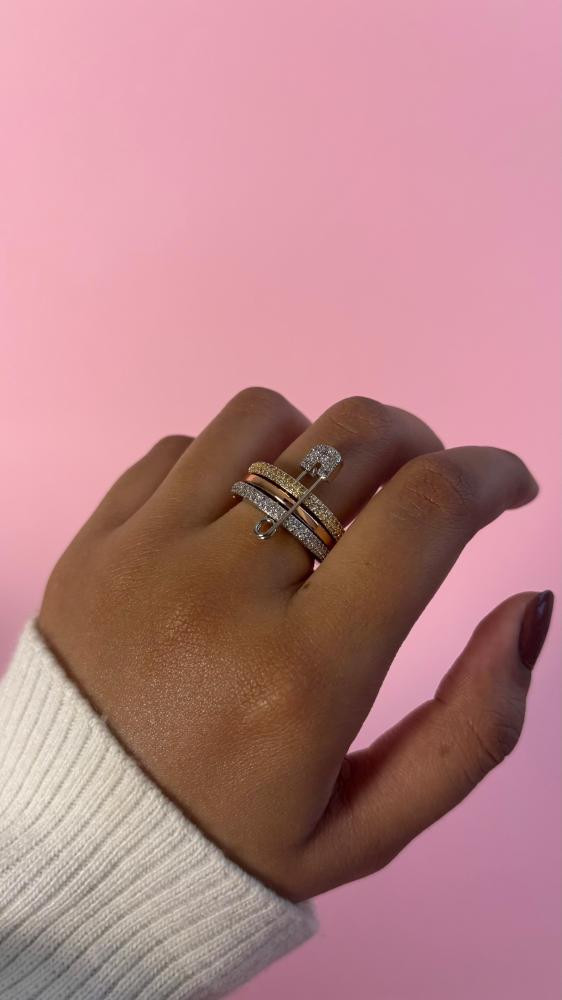 ✨ خاتم الدبوس الثلاثي – تصميم مبتكر يجمع بين الفضي، الذهبي، والروز قولد، مزين بفصوص لامعة تضيف لمسة جرأة وأناقة لإطلالتك اليومية والمناسبات